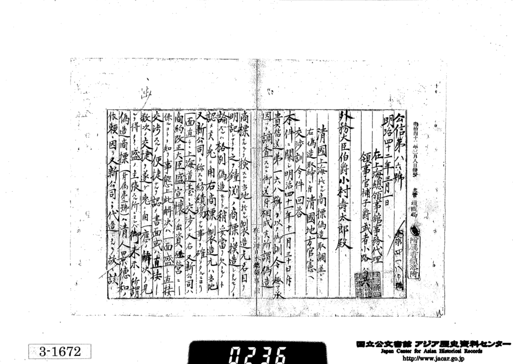 「2.綿糸商標偽造ノ件」JACAR(アジア歴史資料センター)Ref.B11091559500、支那ニ於テ本邦専用商標保護雑件(3.5.6.8)(外務省外交史料館)