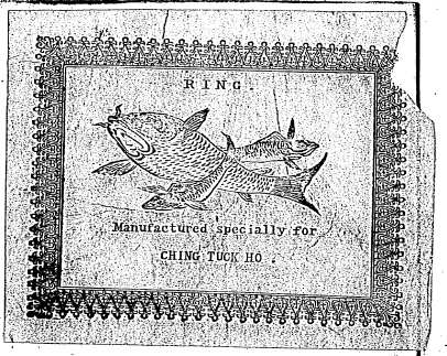 「CHING TUCK HO」とあるのは「景徳和」のことでしょう。日本と中国の漢字の読み方が異なるように、中国では同じ中国国内でも地域によって幾通りの異なる漢字の読み方があります。「景徳和」は中国の標準語である普通話では、読み方を「jing de he」と表記しますが、中国語をラテン文字表記する方法の一つであるウェード式では、「景」「和」はそれぞれ「ching」「ho」と表記します。いずれも中国南方での発音に基づきます。また、「徳」はマレーシア等では「tuck」と表記します。まだ普通話が制定されておらず、中国語のラテン文字表記も一般化、定式化していない当時において、複数の地域の発音に基づく表記が入り混じることは不自然なことではありません。